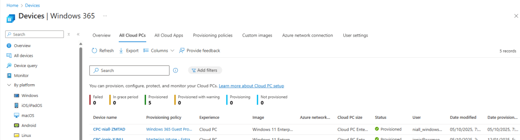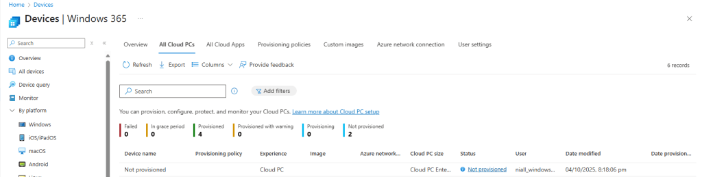 Back in the Intune admin center, under Devices | Device onboarding | Windows 365 | All Cloud PCs there should be a Not provisioned Cloud PC. It reports as Not provisioned as the user has not been assigned a provisioning policy.