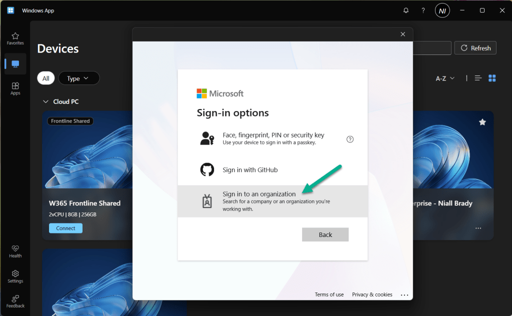 As with the Windows App, they enter the domain name of the organization hosting the Windows 365 Cloud PC.