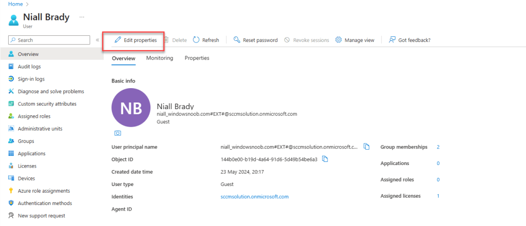 To fix this up for us, we went to the Entra admin center and clicked on Users. We located Niall’s guest account and clicked Edit properties.