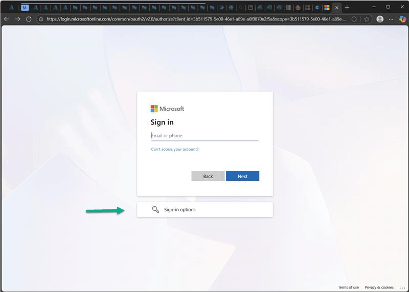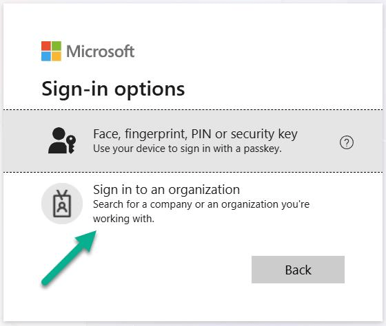 After selecting Sign-in options, choose Sign in to an organization.