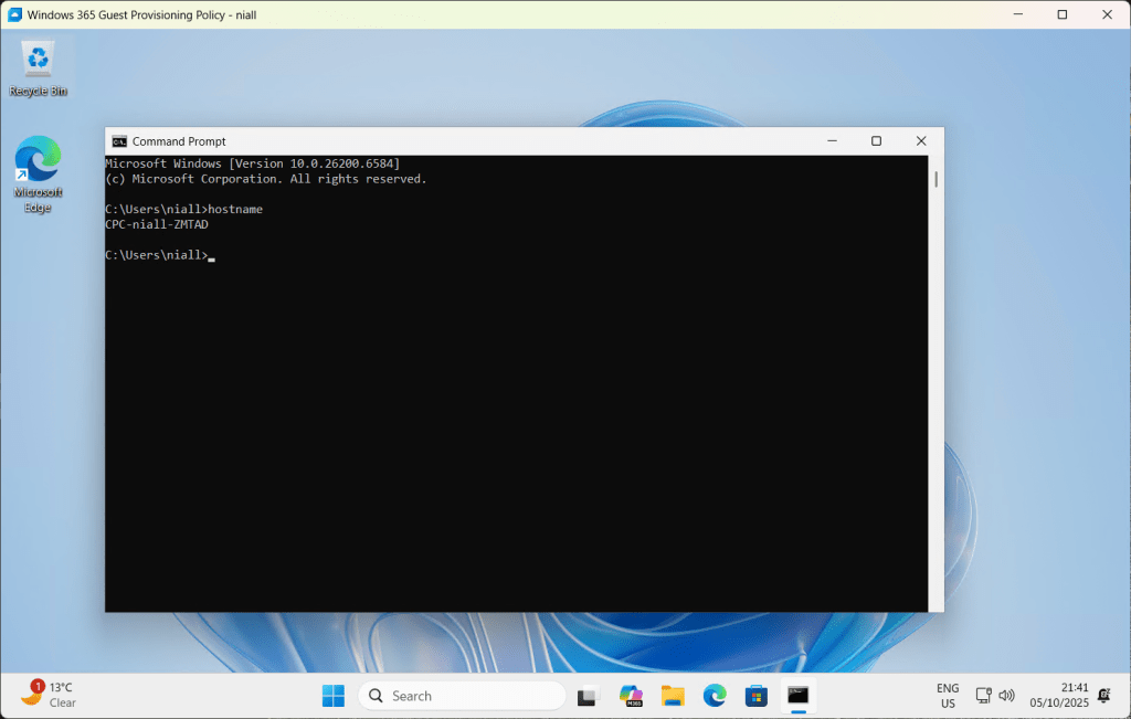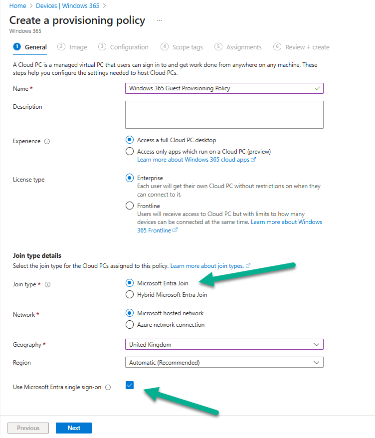 To resolve this we can either create a provisioning policy and assign this or we can use an existing policy, so long as we have single sign-on enabled and that the Cloud PC is running with 2025-09 Cumulative Updates for Windows 11, version 24H2 (KB5065789) or later. If using an existing policy, take a look at the assignment to ensure that Niall’s account is targeted.