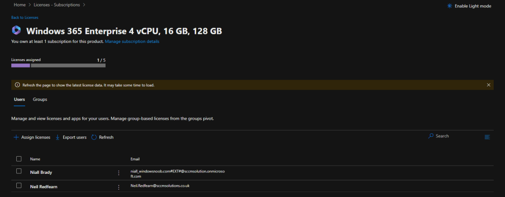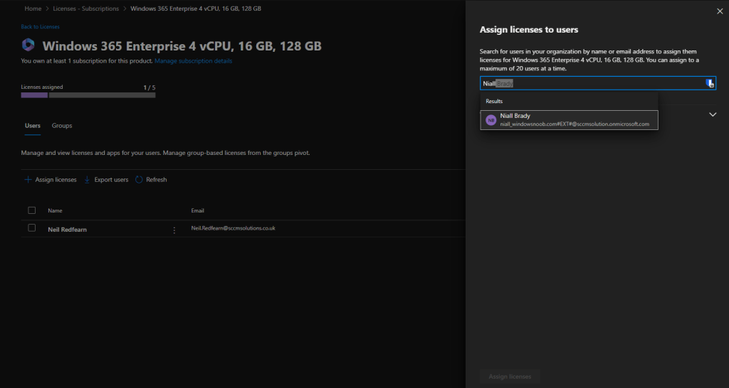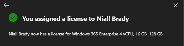 After a short period of time, we were able to assign a licence to Niall’s account with no issue.